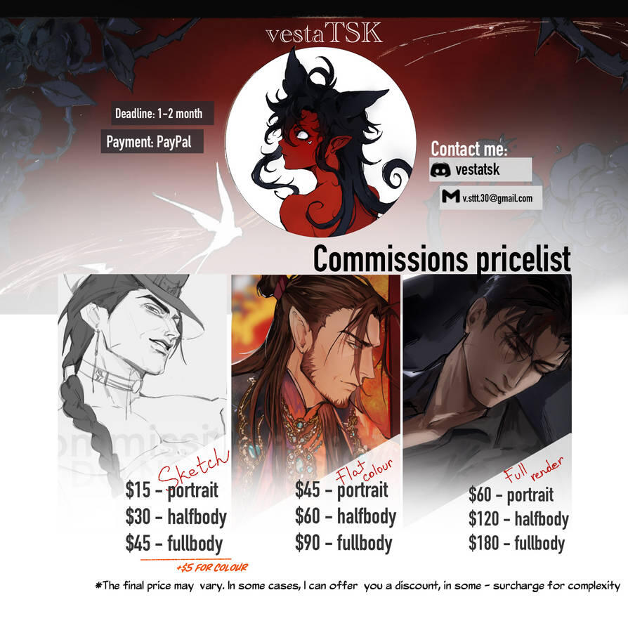 Payments will only be accepted through PayPal in USD. I require full payment before starting a commission. However, prepayment is possible (50% now), the rest of the payment after the sketch/line. In my country, PayPal's functionality is limited, so it only accepts donations (transfers from family to friends).Deadlines: